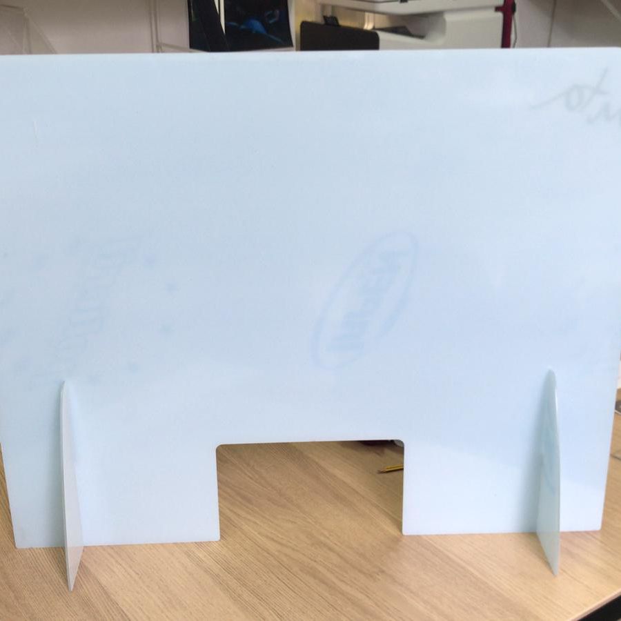 Mamparas realizadas sobre metacrilato de 3 o 5 mm, con ventanilla para la atención al cliente. Incluye soporte de metacrilato fácil de montar en 30 segundos. Hemos realizado unas medidas estándar con precios para facilitar la decisión de los clientes, pero al diseñarlas nosotros las podemos fabricar de la medida que se desee. Son completamente transparentes y fáciles de desinfectar.