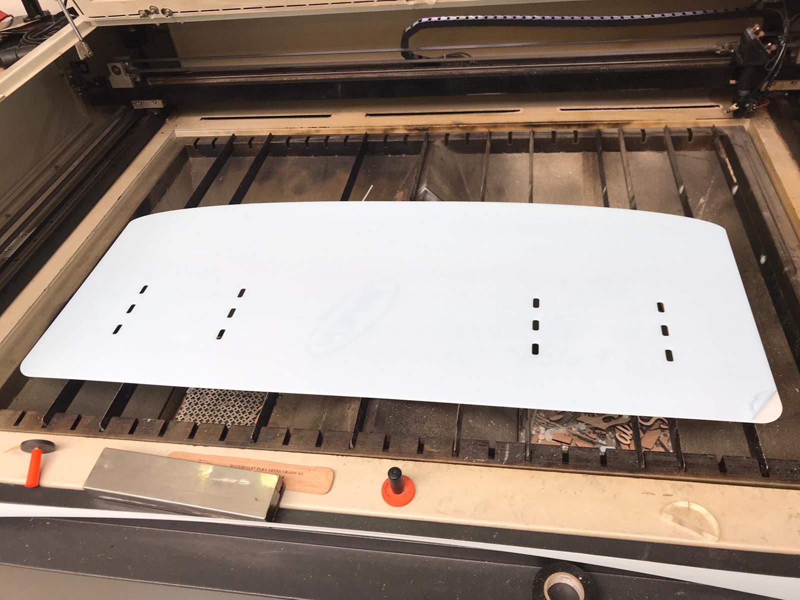 El resto de elementos de protección los realizamos con la máquina de corte láser, que nos permite cortar piezas de metacrilato y PET para elaborar diferentes elementos, cuya medida y forma son adaptables.