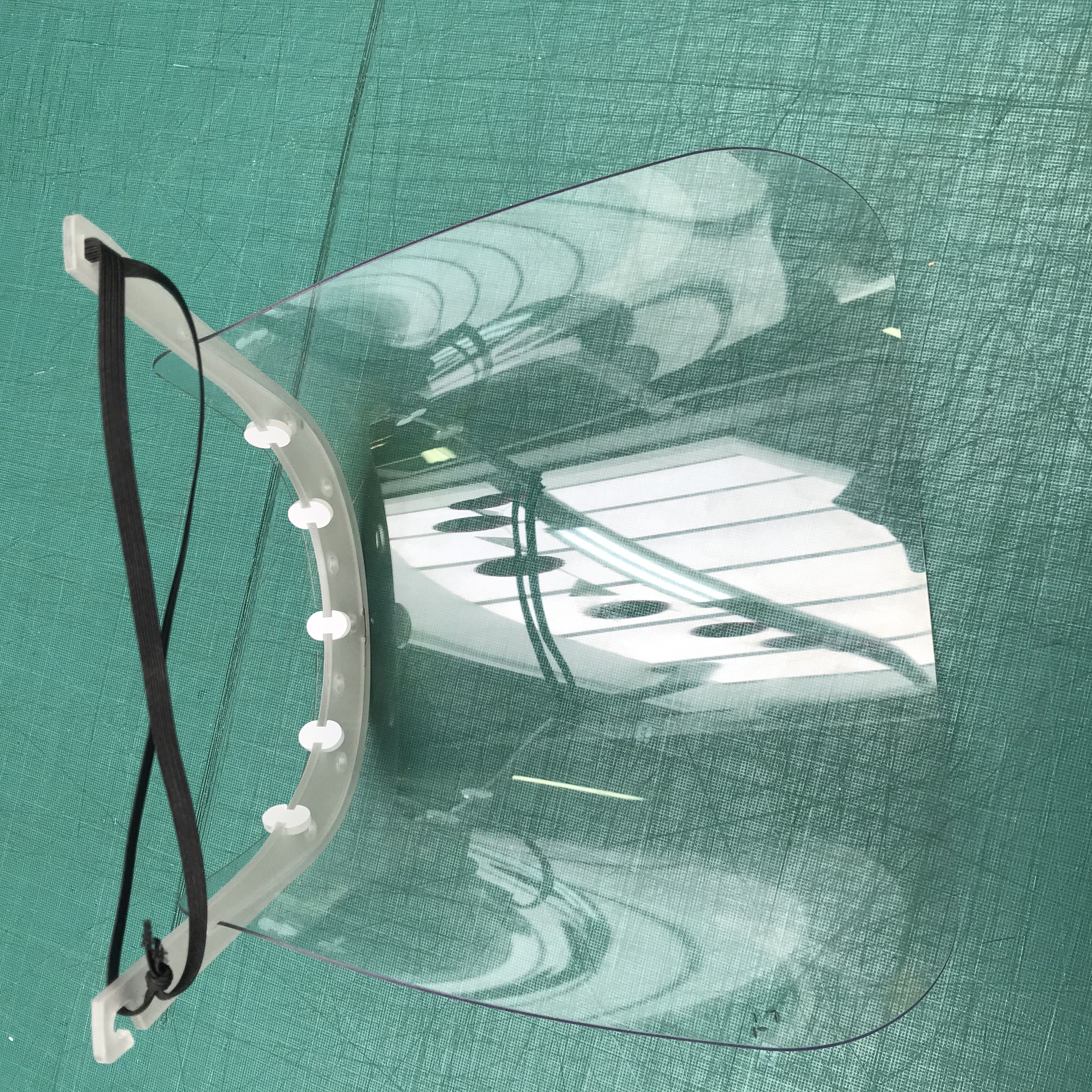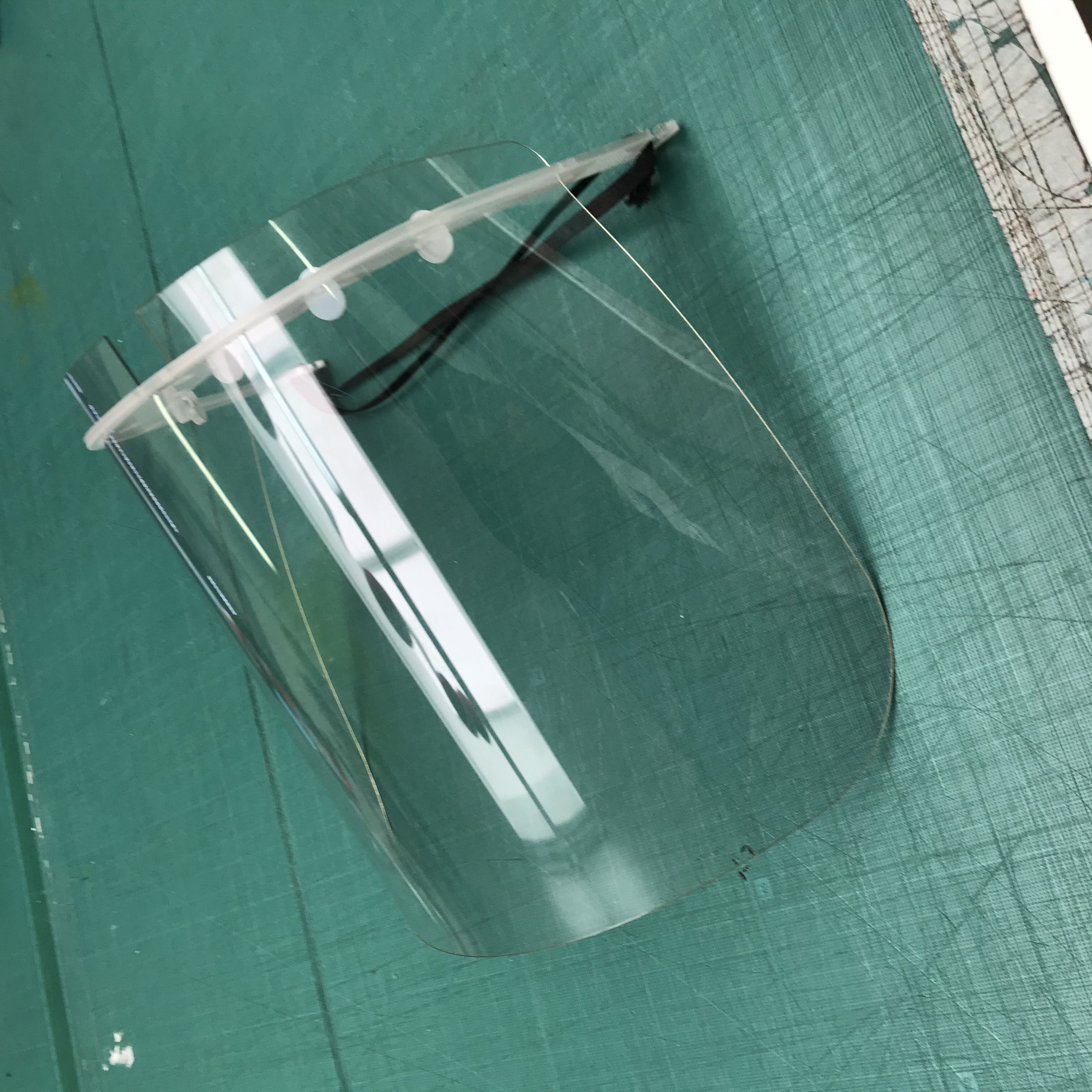 Careta fabricada en metacrilato (soporte) i Policarbonato (pantalla), fácil de montar y desinfectar. Se ajusta con una cinta elástica, goma, etc. Con soporte para la frente, en el cual, si se quiere, se puede colocar una gasa o espuma. Completamente transparente a diferencia de las que se hacen con laminas de encuadernación.